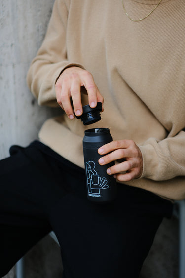 Dubbelwandig vacuum insulated drinkfles van roestvrij staal als collab met ons favoriete Japanse merk KINTO! Deze toffe thermosfles houdt koffie en thee warm én koud voor zo'n zes uur. Uitermate geschikt om koude dranken, zoals ijskoffie en -thee meerdere uren goed koud te houden. De fles heeft een handig klepje ingebouwd die de drank goed doseert en eventueel ijsblokjes in de fles houdt. De buitenzijde van de fles is voorzien van een poedercoating. Het ontwerp is gemaakt door illustrator Gino Hoiting.