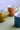 Kleuren: mosterdgeel, indigoblauw, pastel roze