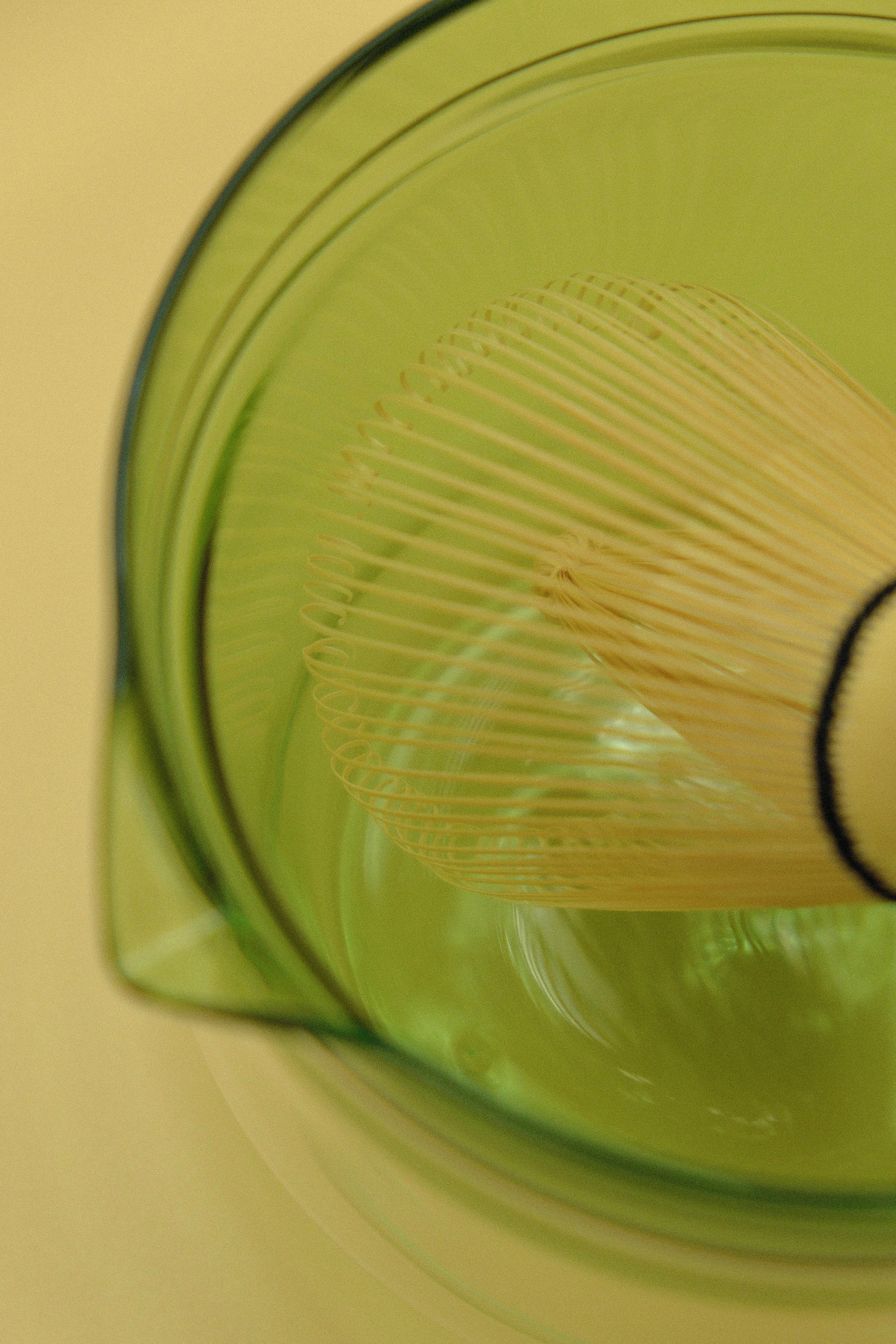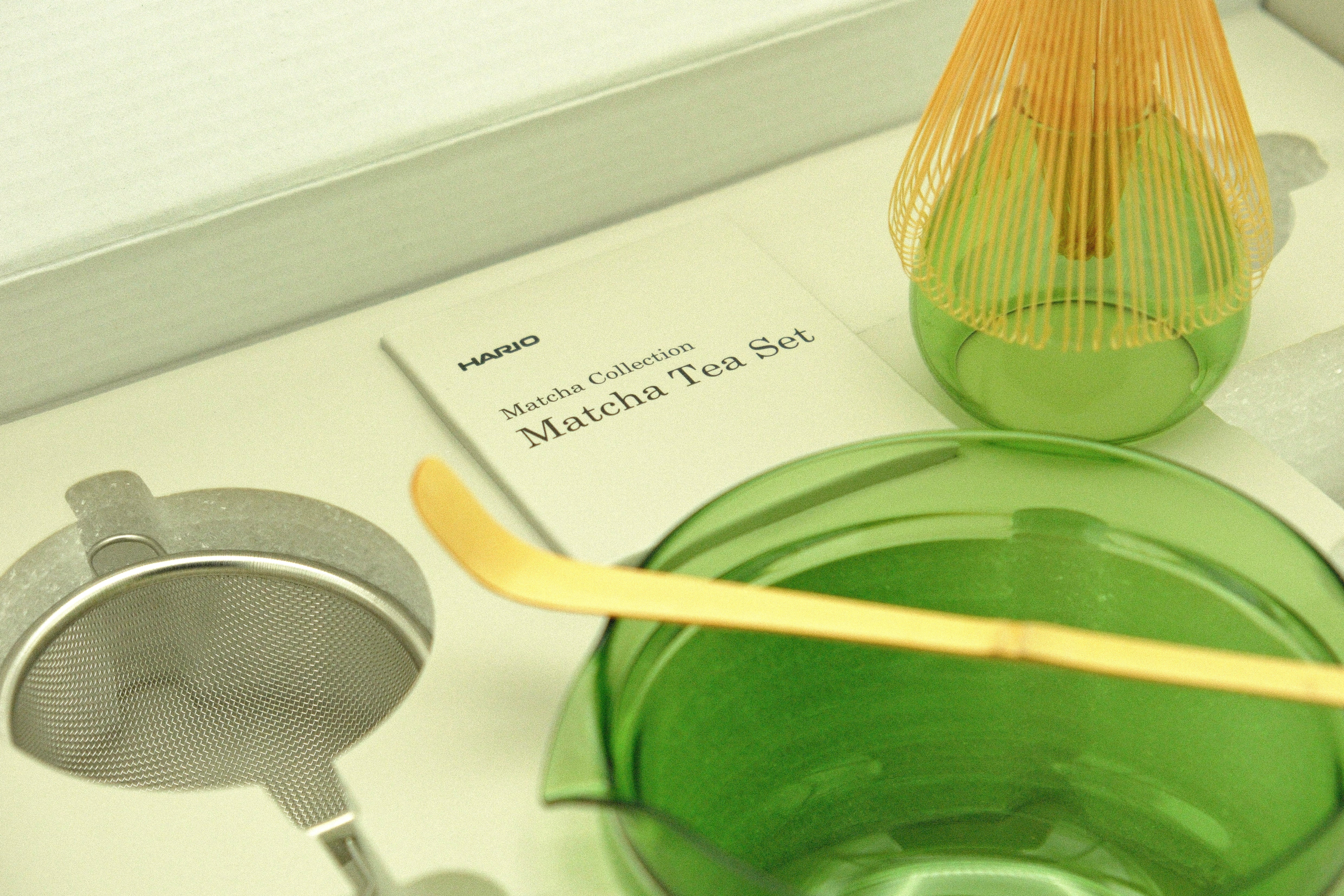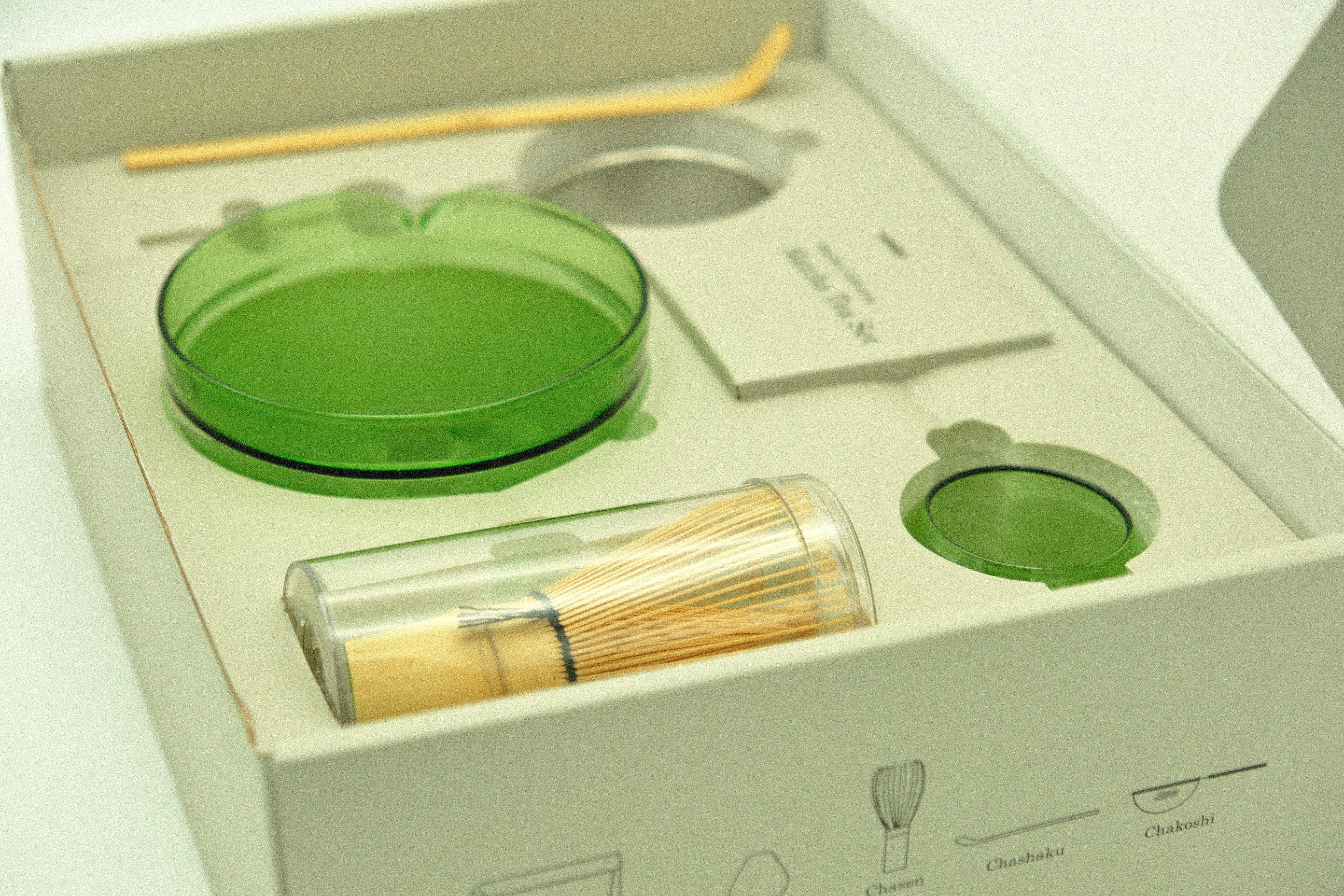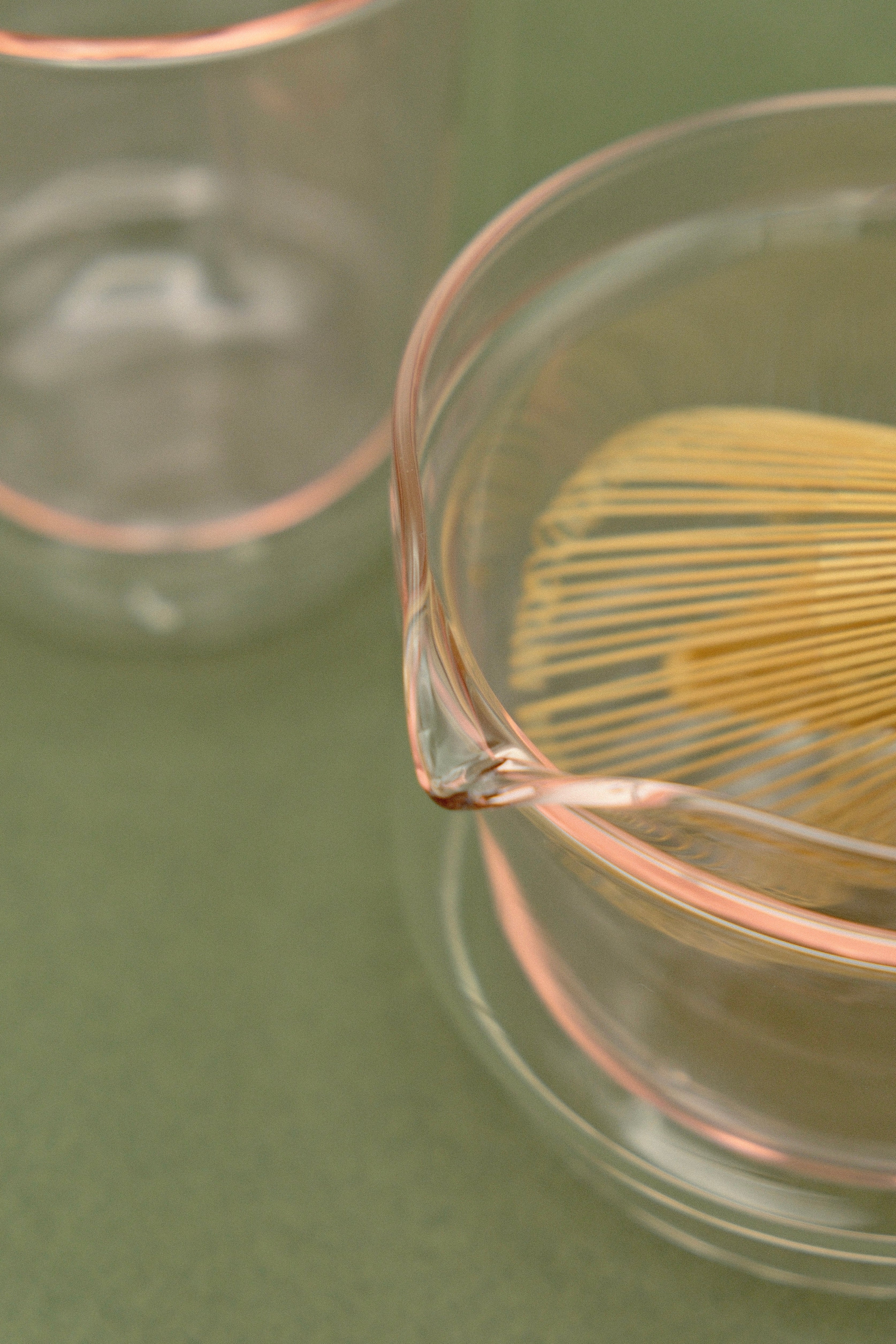 - Materiaal: bowl en stand hittebestendig glas / chasen en chashaku bamboe / zeef roestvrijstaal